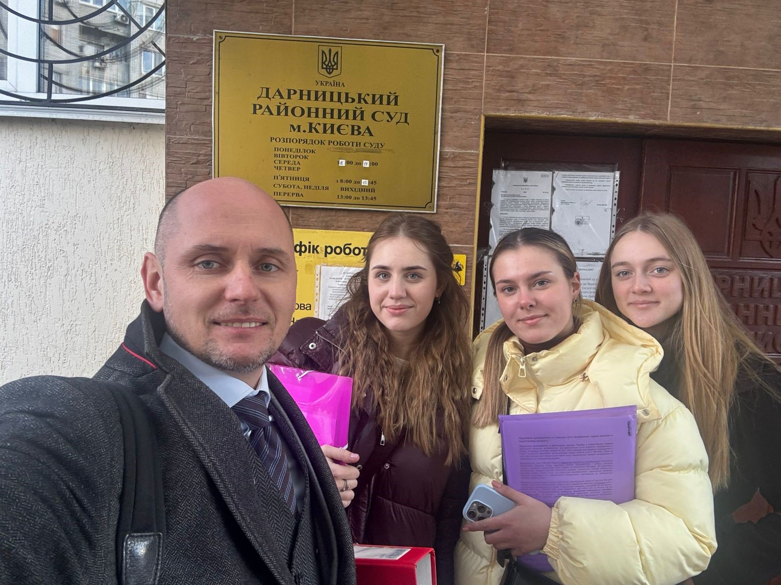 02 березня здобувачі освіти 3 курсу Софія Зима, Евеліна Асанова та Анастасія Сердечна, разом зі старшим викладачем кафедри цивільно-правових дисциплін Юрієм Лимарем, здійснили візит до Дарницького районного суду міста Києва, де відвідали судове засідання у справі № 753/6071/23. Під час судового розгляду здобувачі мали змогу безпосередньо спостерігати за перебігом судового процесу, ознайомитися з процесуальними правами та обов’язками учасників справи, порядком дослідження доказів і особливостями проведення судових дебатів.