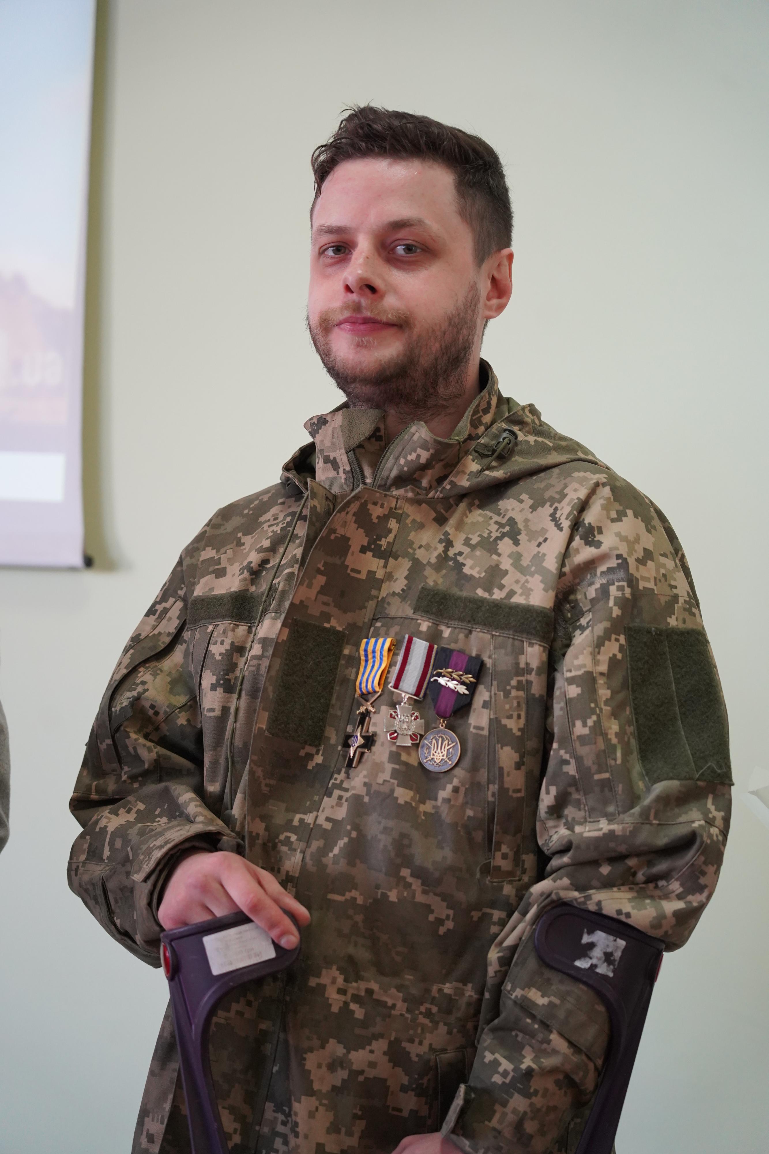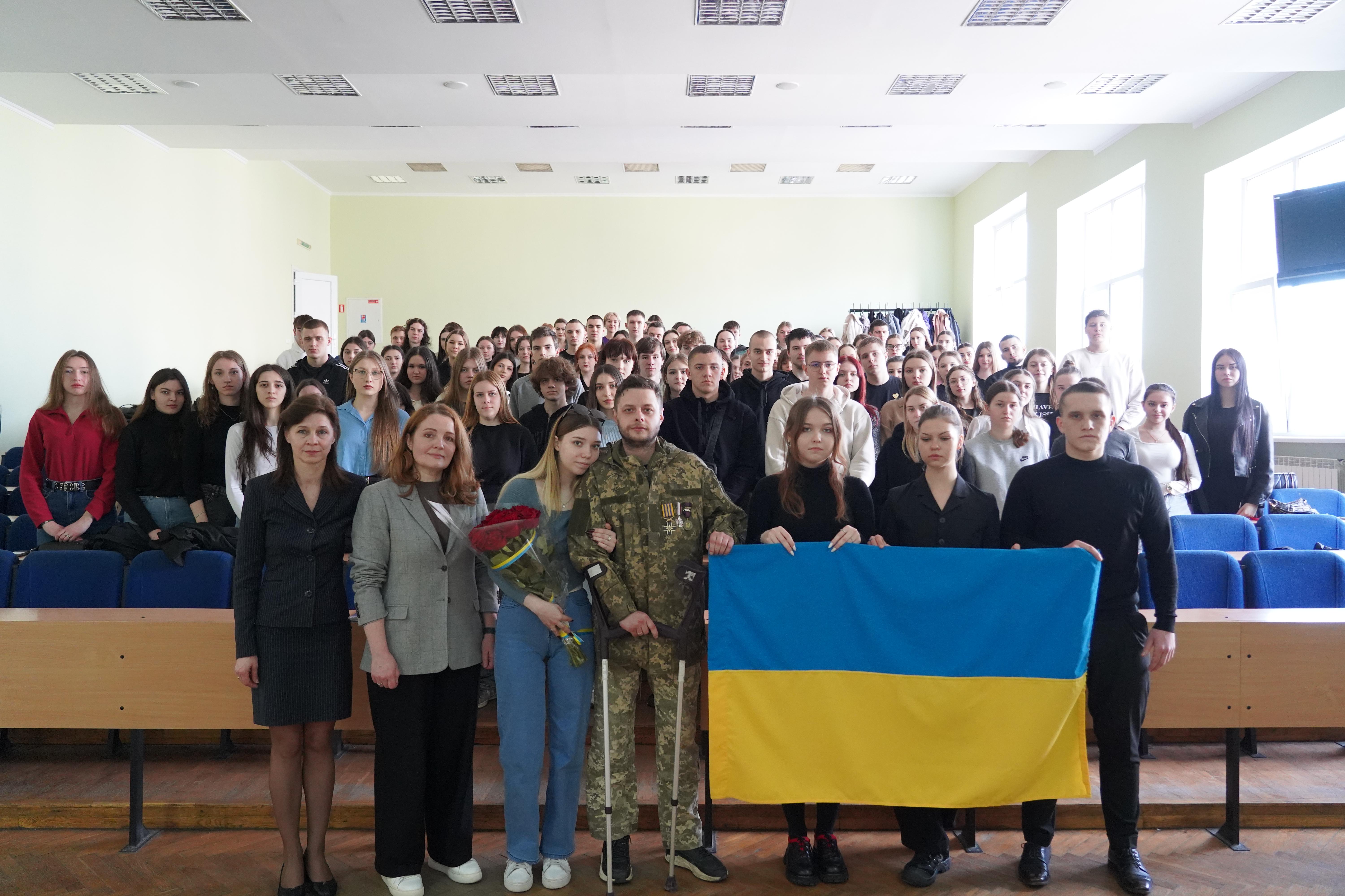 Цього дня на зустріч зі студентською молоддю до академії завітав учасник бойових дій молодший сержант Євгеній Потапенко. Наразі Євгеній проходить реабілітацію, оскільки отримав важке поранення в бою, втратив кінцівку, тож разом з ним була його ангел-охоронець – дружина Катерина. Військовий розповів про свій бойовий шлях, побратимів, які для нього вже стали родиною, дав настанови студентам щодо військової підготовки, закликав підтримувати Збройні Сили України.